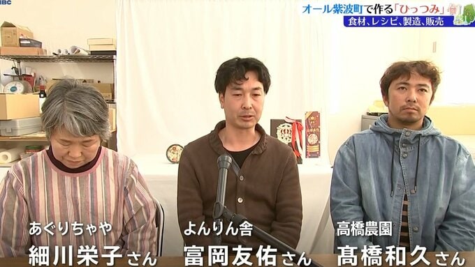 レシピを考案したのが県の食の匠に認定されている細川栄子さん、製造を行うのが高橋農園の高橋和久さん、そして販売するのは、町内のまちづくり会社、よんりん舎の富岡友佑さんです。