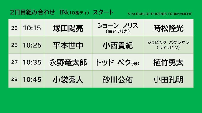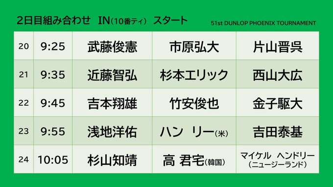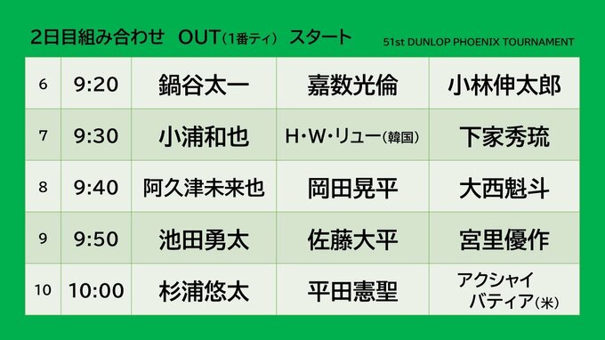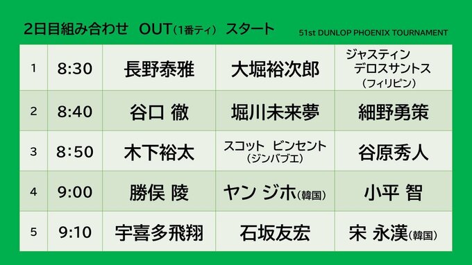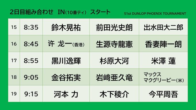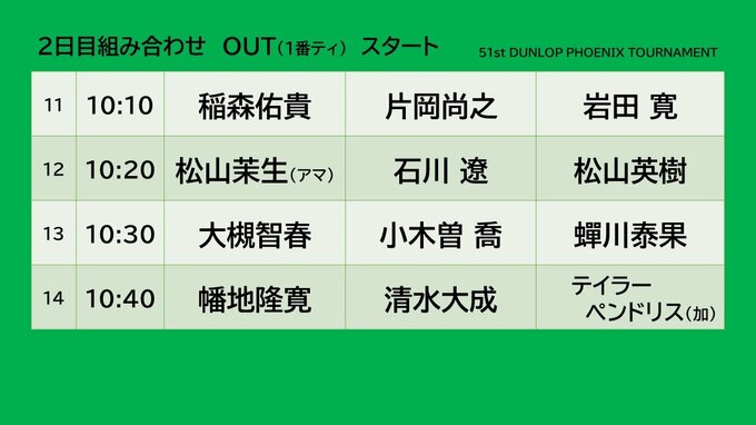 宮崎市で開催されているダンロップフェニックストーナメント予選ラウンド2日目の主なペアリングとスタート時間です。