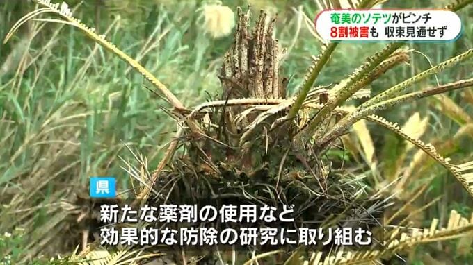 県によりますと、奄美大島の道路や公園などではおととしの初確認以降およそ7000本の被害が出ているということです。最初の被害が確認された奄美市は、「およそ8割のソテツが被害を受けている」とみています。