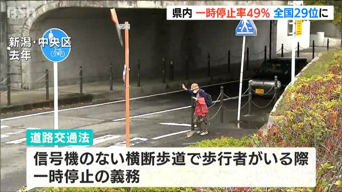 信号機のない横断歩道で車が一時停止する割合が新潟県内で49%だったことがJAFの調査で分かりました。去年の全国最下位から29位に上がりましたが、全国平均には届いていません。