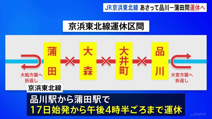 JR京浜東北線は、大井町駅周辺の再開発に伴う工事の影響で、あさっての始発から午後4時半ごろまで一部の区間で運休します。JR東日本は、大井町駅周辺の再開発の一環で、駅のホームの一部を最大70センチ拡張するほ…