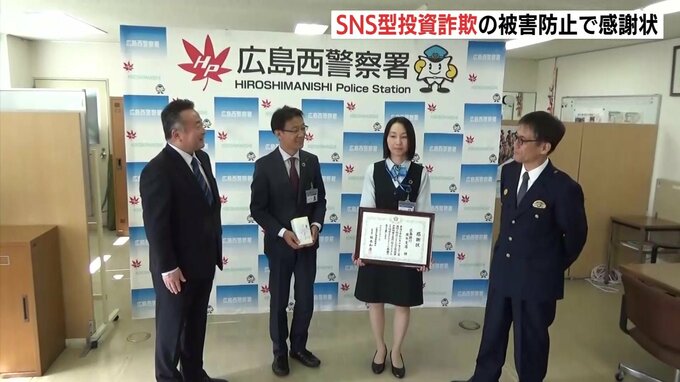 広島県内で相次いでいるSNS型投資詐欺の被害を防いだとして、金融機関に感謝状が贈られました。