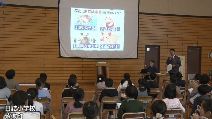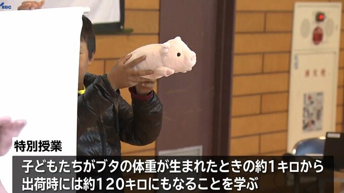 このうち日詰小学校では15日、町内の生産者が給食の時間を前に3年生を対象とした特別授業を行い、子どもたちはブタの体重が、生まれたときの1キロほどから出荷時には120キロほどにもなることを学びました。