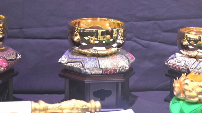 会場には純金や18金でつくられた工芸品約200点がずらりと並び、まばゆい輝きを放っています。