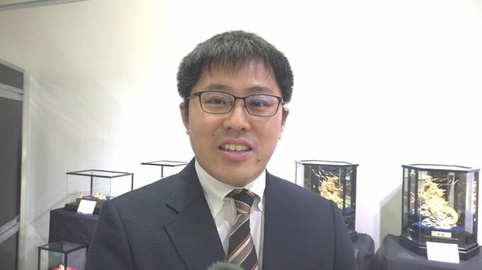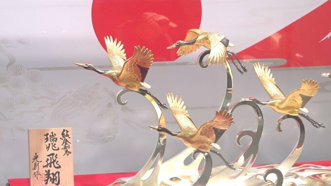 金の工芸品を展示販売する黄金作品展は17日の午後5時まで岡島2階の特設会場で行われます。