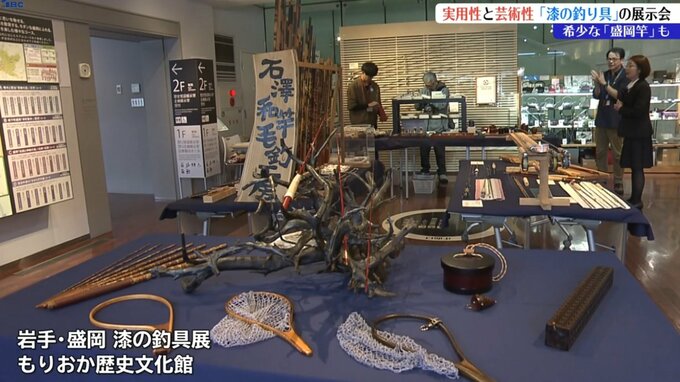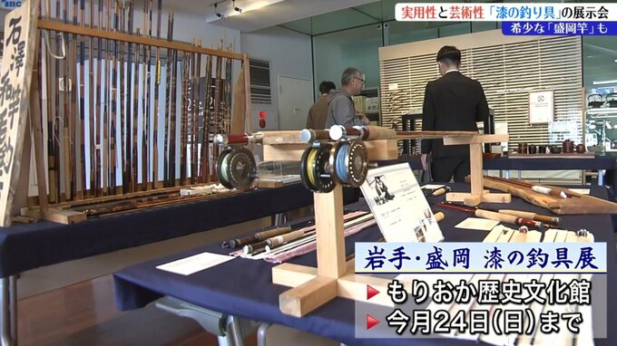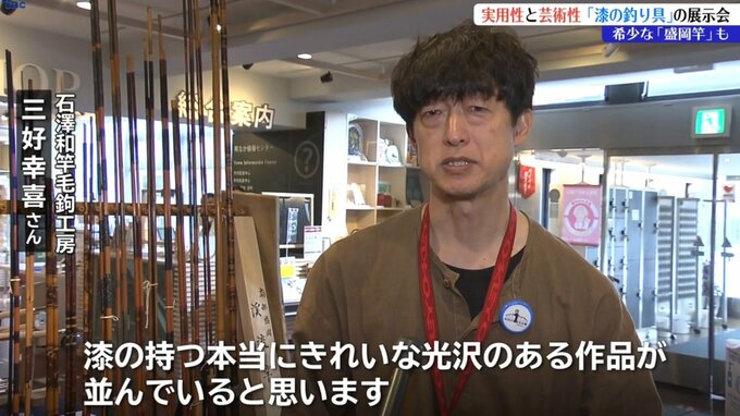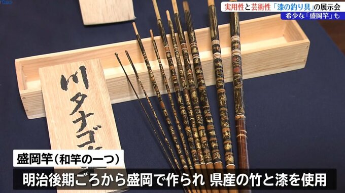 もりおか歴史文化館で15日始まったこの展示会は、岩手県内で漆を使った釣りざおやルアーなどを手がける3つの工房が初めて開いたものです。