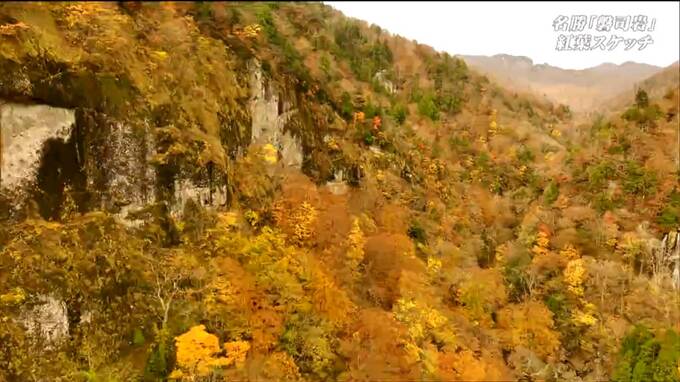 仙台市の西部にあり、垂直な岩の壁が連なる「磐司岩」は、市内の名勝のひとつとなっています。この「磐司岩」周辺の紅葉をカメラがスケッチしました。
