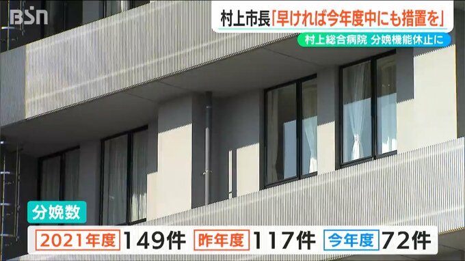 JA新潟厚生連によりますと、村上総合病院での分娩数は、2021年度に149件、22年度は130件、2023年度が117件と年々減少し、2024年度は72件の見込みとなっています。
