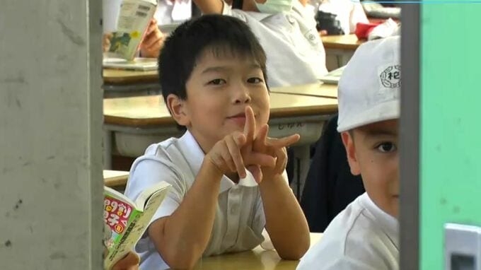 慣れないインタビューに緊張しつつも、教室に戻ると、こっそりピースするお茶目な一面を見せてくれた総一郎君。