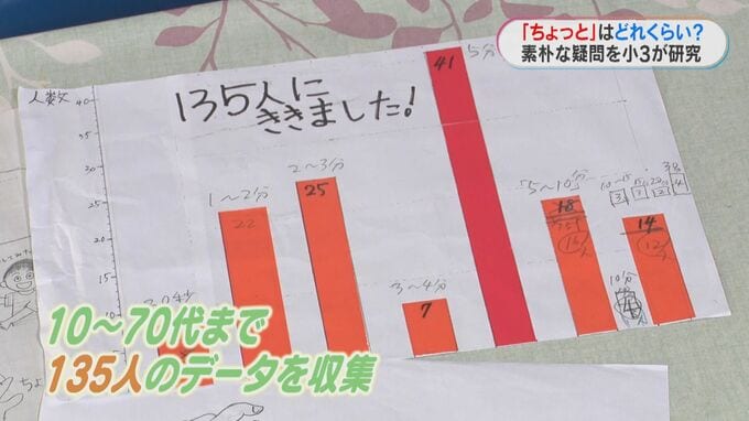 自由研究では、”ちょっと”を調べるため、学校で使うタブレットでクラスメイトにアンケートをとったり、家族の協力をもらいLINEや電話で集めたりして、10~70代まであわせて135人のデータを収集。