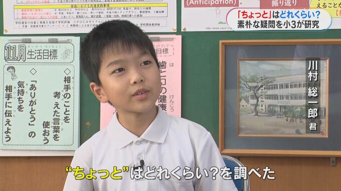 姶良市立柁城小学校3年生の川村総一郎君(9)です。総一郎君が夏休みの自由研究で行ったのが、「”ちょっと”の時間はどのくらい???」と題した、”ちょっと”の研究です。