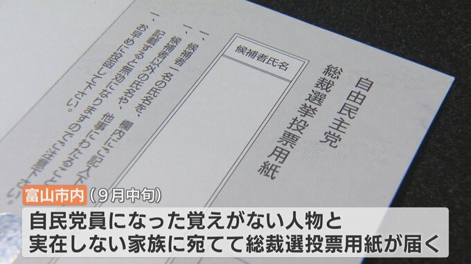 富山市内で自民党員になった覚えがない人物と実在しない家族に宛てて総裁選の投票用紙が送られてきたのです。分かっているだけで77枚ありました。