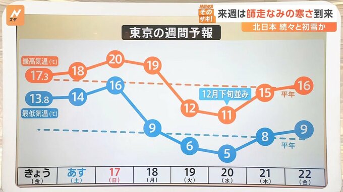 18日(月)、19日(火)は北海道では雪が降るようになり、東京あたりでも最低気温は5℃~6℃なので「寒さが急にやってきた」という感じになると思います。
