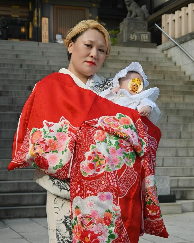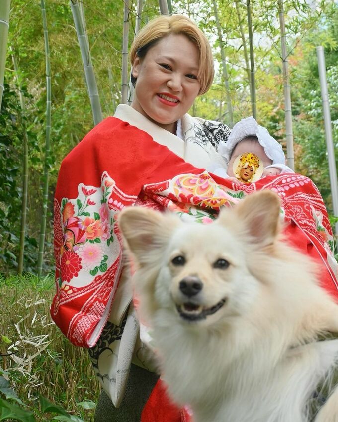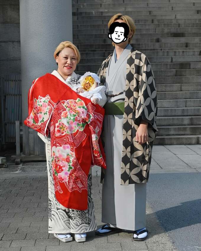 そんなバービーさんは、白い生成り色の布地に墨色で「昇り龍と波」が描かれた “攻め” の図柄の和装を着こなし、真ん中に大きく牡丹の花が描かれた真っ赤な産着をかけて、第一子の赤ちゃんを抱き上げています。また、夫も同様に金髪に髪を染め、白梅鼠色の着物に松葉色の帯をきりりと締め、黒の七宝柄の羽織を着こなす “いなせ” な和装。この仕上がりに、バービーさんは「#必死になって色々教えてくれたお着物屋さんありがとう」とハッシュタグを追加して感謝を表現。