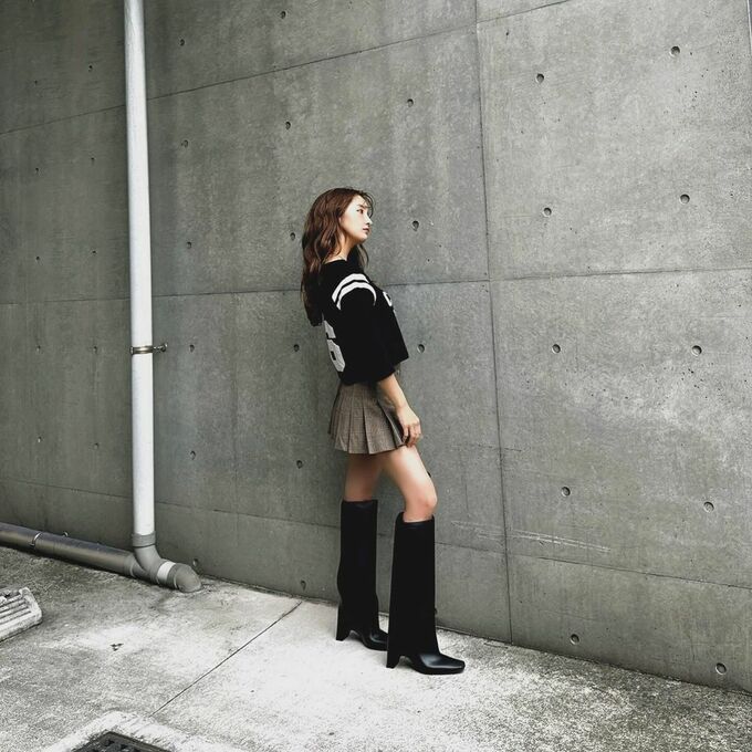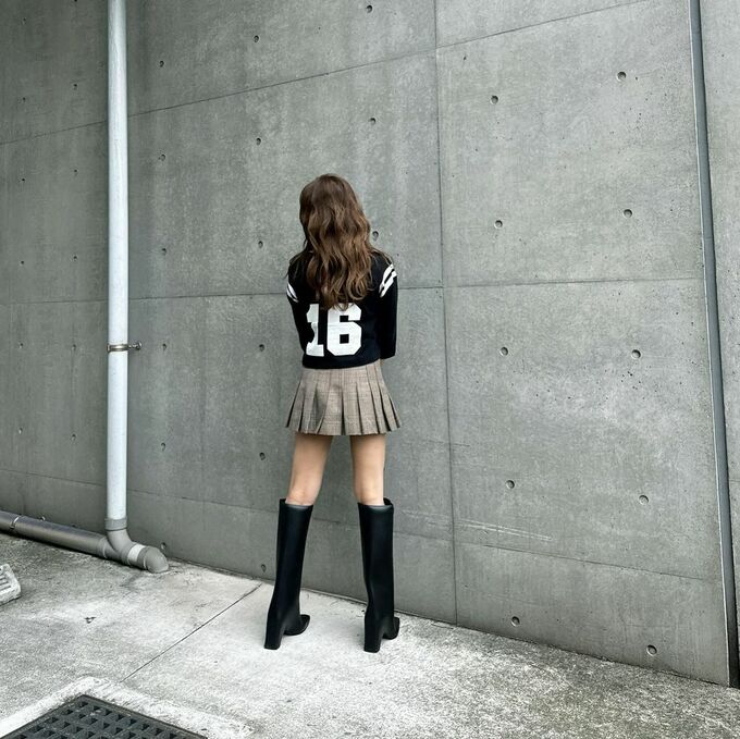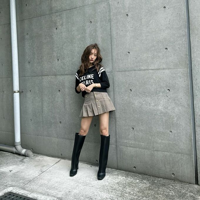 写真ではチェックのプリーツスカートにショート丈のトップス、黒のニーハイブーツを合わせ全方向からのポージングを披露しています。