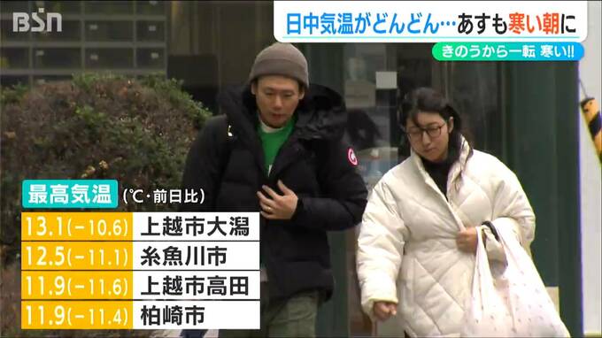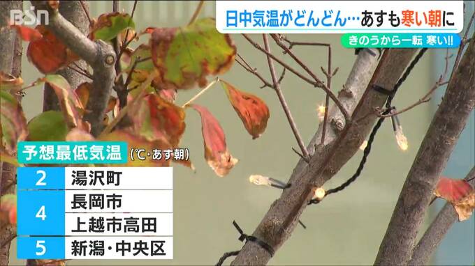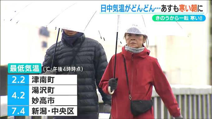 ただ最高気温を観測したのは日付が変わった直後から未明にかけて。日中から夕方にかけて気温はどんどん下がり、午後4時までの最低気温は津南町で2.2℃、湯沢町と妙高市 関山4.2℃、新潟市 中央区で7.4℃などとなっています。