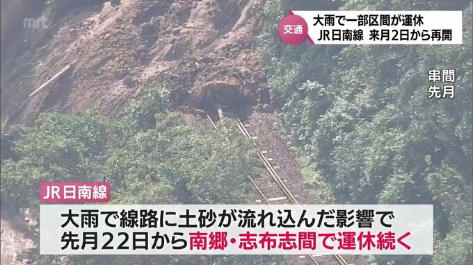 先月の大雨の影響で、一部の区間で運休が続いていたJR日南線について、JR九州は、来月2日から全線で運行を再開すると発表しました。JR日南線は、大雨で線路に土砂が流れ込んだ影響で、先月22日から南郷・志布志間…