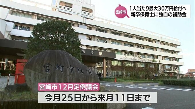 宮崎市は来年度から市内の幼児・保育施設に就職する新卒の保育士に1人当たり最大30万円を給付する方針を示しました。宮崎市は、今月開会する12月定例議会で17の議案を提案することにしていて、一般会計補正予算案…