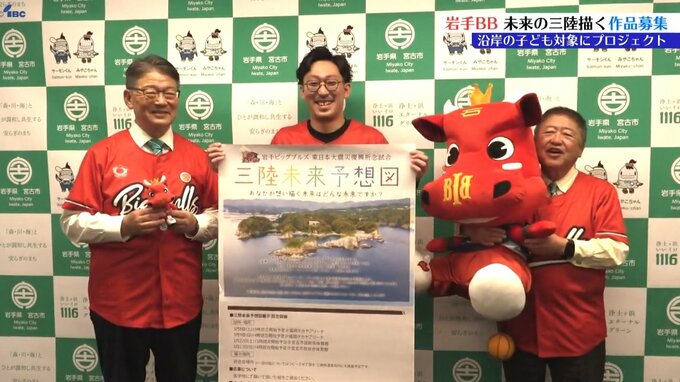 バスケットボールB3の岩手ビッグブルズは、未来の三陸を想像した絵を沿岸の子どもたちから募集するプロジェクトを企画し、18日記者発表を行いました。記者発表は宮古市役所で行われ、岩手ビッグブルズの水野哲志社…