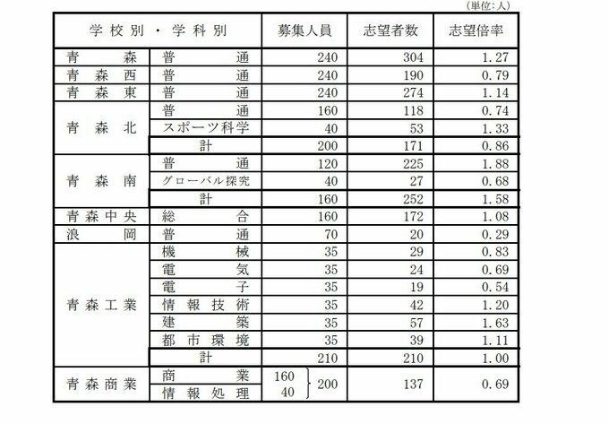 青森県立高校 志望倍率 青森1.27倍、弘前1.27倍、八戸1.05倍など… 全日制志望倍率0.94倍【全校掲載・学校別倍率一覧】 進路志望状況第1次調査結果