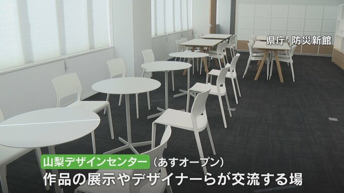 県庁の防災新館に20日にオープンする山梨デザインセンターには作品の展示やデザイナーやクリエイターが交流できるスペースが設けられています。