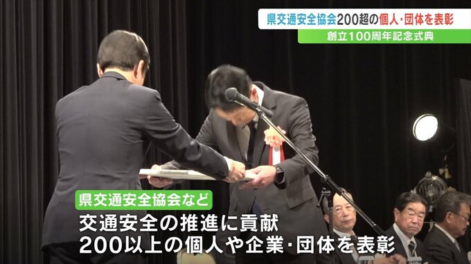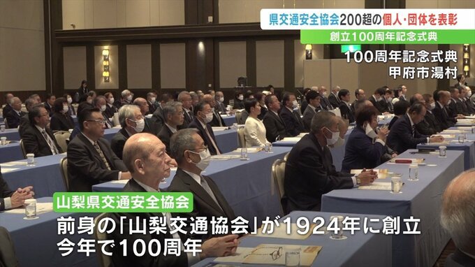 山梨県の交通安全協会が創立100周年を迎えたことを記念した式典が開かれ、交通安全の推進に貢献した200を超える個人や団体が表彰されました。