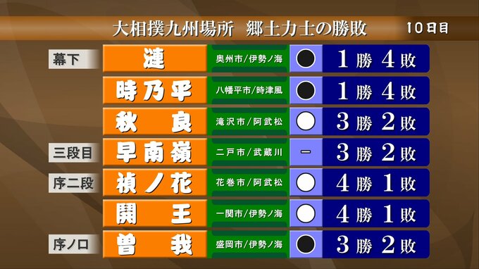 大相撲九州場所10日目の19日、郷土出身力士の取り組みの結果です。