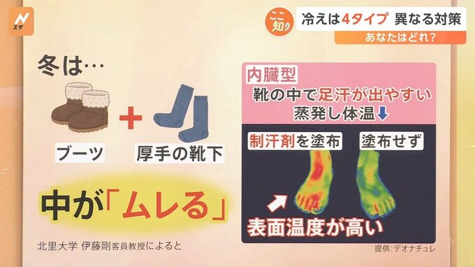 冬はブーツや厚手の靴下を履くため重装備になり、中が「ムレる」という経験をしたことがないでしょうか。特に内蔵型の人は、靴の中で足汗が出やすく、それが蒸発して体温が下がってしまいやすいそうです。