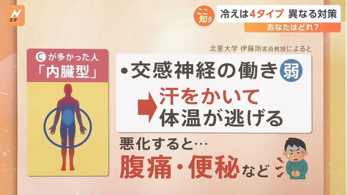 続いて、▼Cが多かった人は「内蔵型」です。交感神経の働きが弱っており、汗をかいて体温が逃げてしまうのだそうです。悪化すると腹痛や便秘などになるといいます。