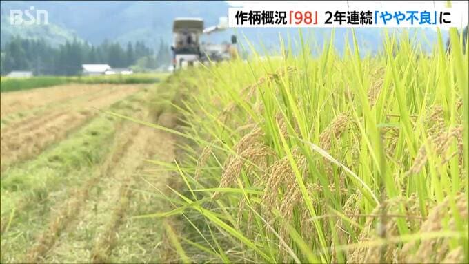 新潟県産米の今年の収穫量は平年を100とした指数で「98」となる見込みで、一等米比率は向上したものの、収量は2年連続で「やや不良」となりそうです。北陸農政局が発表したコメの作柄概況によりますと、先月25日現…
