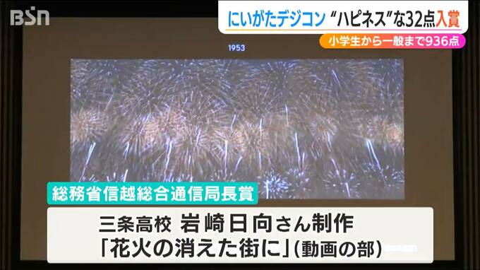 動画の部では、三条高校の岩崎日向さんがつくった「花火の消えた街に」が総務省信越総合通信局長賞を、静止画の部では、直江津中等教育学校の野村柳花さんがつくった「この日々の幸せを描く」のほか2作品が県知事賞に輝きました。