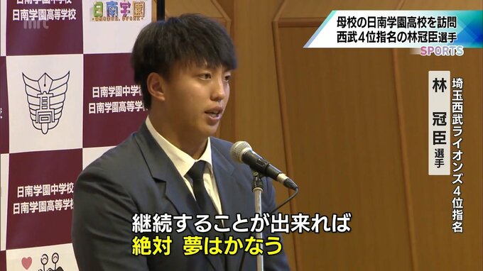 先日のプロ野球ドラフト会議で埼玉西武ライオンズから4位指名を受けた日南学園高校出身の林 冠臣 選手が母校を訪問しました。日南学園高校を訪れたのは埼玉西武ライオンズから4位指名を受けた林 冠臣(リン クァン…