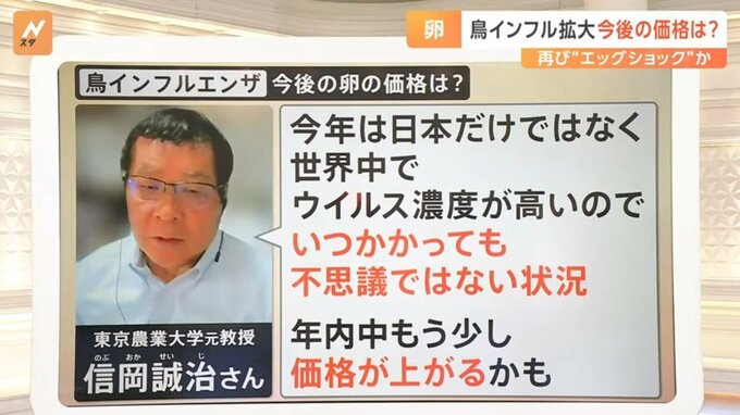 東京農業大学元教授の信岡誠治さんは「今年は日本だけではなく、世界中でウイルス濃度が高いので、(鳥インフルエンザに)いつかかっても不思議ではない状況。年内中もう少し価格が上がるかも」といいます。