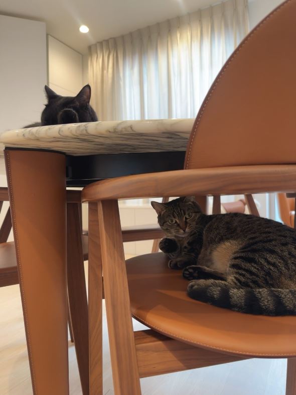 川崎さんは「エルメスの革が、、、」と題して投稿。写真には、大理石を削り出した天板に、皮革で包んだ脚部を組み上げられた高級なテーブルと椅子、そしてその家具に堂々と居座る2頭の猫たちが写っています。