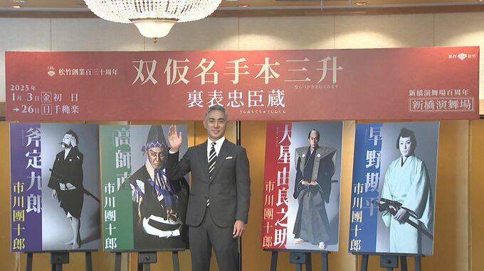 歌舞伎俳優の市川團十郎白猿さんが、2024年1月新橋演舞場公演「双仮名手本三升(ならべがきまねてみます) 裏表忠臣蔵」の取材会に登壇しました。