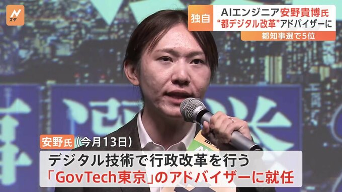 今年7月の東京都知事選挙に立候補したAIエンジニアの安野貴博氏が、デジタル技術で行政改革を行う都の外郭団体のアドバイザーに就任したことが、関係者への取材でわかりました。過去最多の56人が立候補し現職の小…