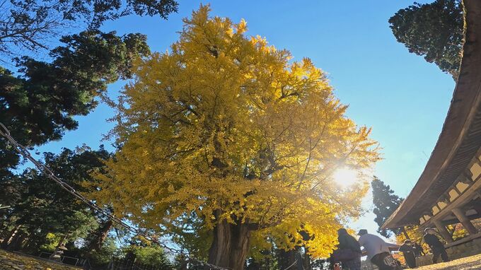 福島県喜多方市にある国指定の重要文化財 新宮熊野神社の拝殿「長床(ながとこ)」、その目の前にそびえ立つ樹齢850年以上の大イチョウが黄金色に染まり見ごろを迎えています。平岡沙理アナウンサー「圧巻ですね…
