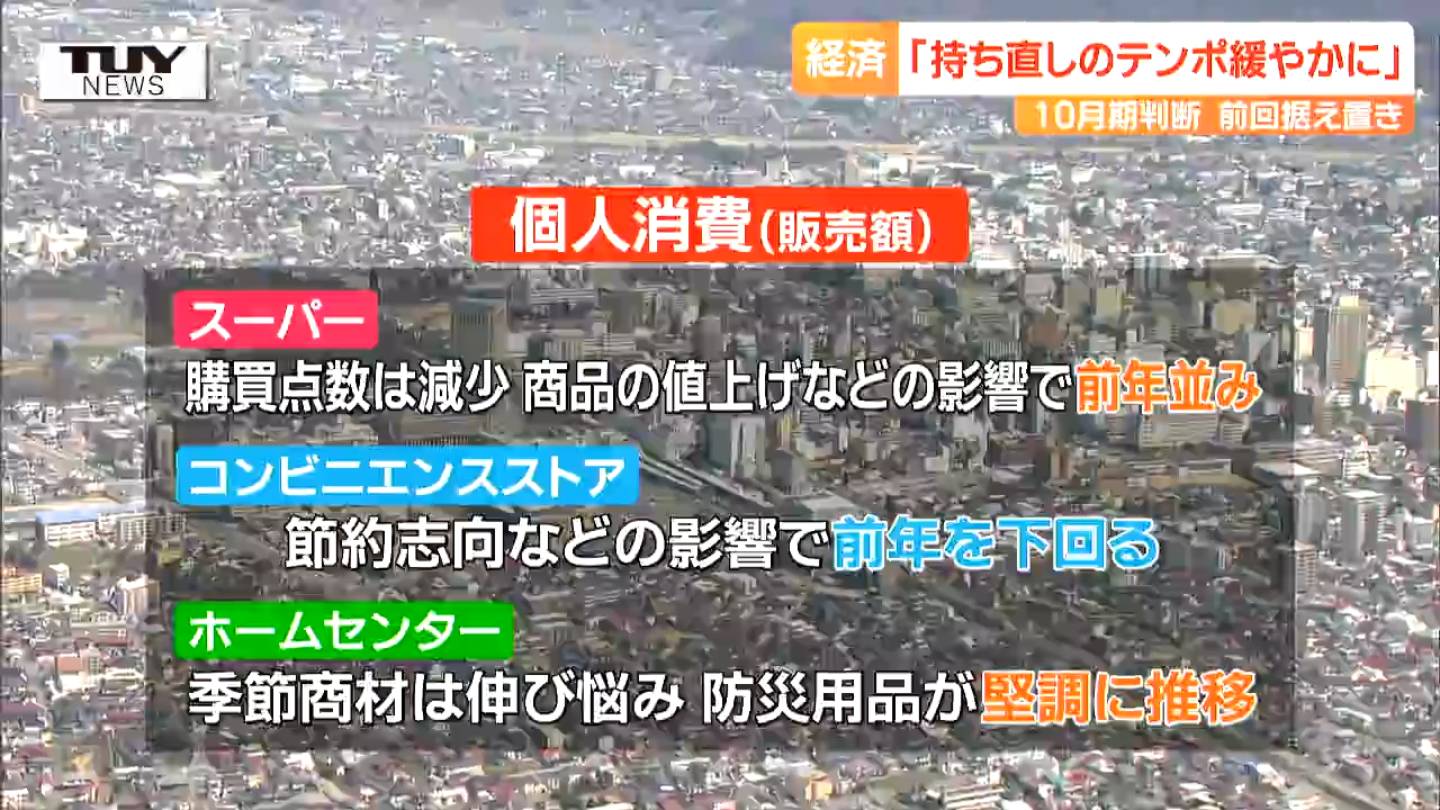 こうした情勢を受け、山形財務事務所は県内経済の概況について、「持ち直しのテンポが緩やかになっている」と前回7月期の判断を据え置きました。