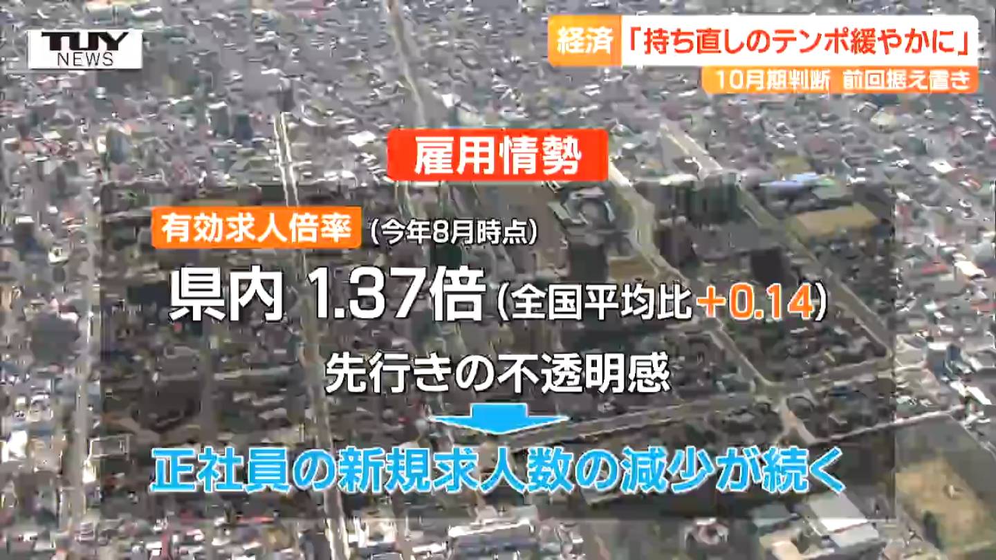 それによりますと、今年10月期の判断は前回の7月期と変わらず、「県内経済は持ち直しのテンポが緩やかになっている」ということです。