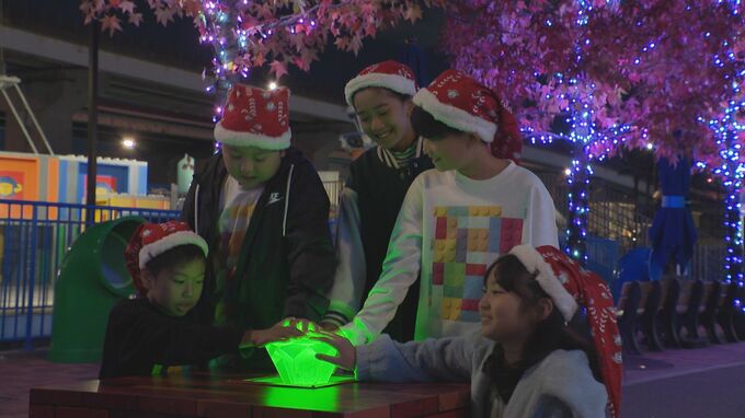 約61万個のレゴブロックでできた高さ10メートルのクリスマスツリーがライトアップされるほか、園内5か所に設置された「ねがいの石」を触ると、サンタさんが子どもたちの願いを叶えるかのように周囲の樹木が一斉に光り出す仕掛けも。