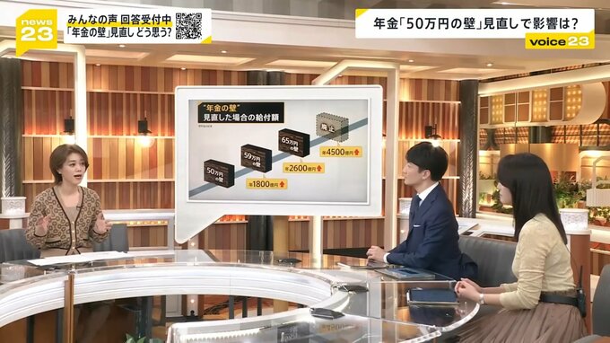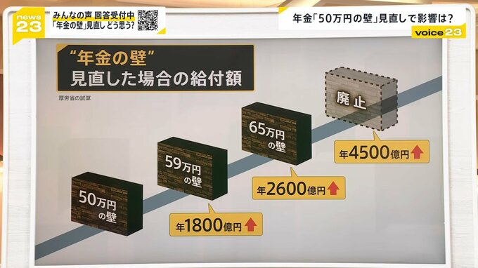 「50万円の壁」を59万円に引き上げた場合は、支払われる年金が新たに1800億円追加、65万円に引き上げた場合は年2600億円、壁そのものを廃止した場合は年4500億円増えるという試算もあります。
