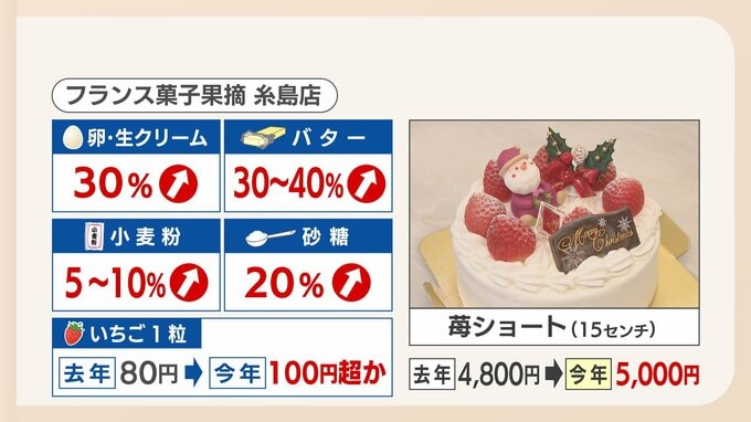 こちらの洋菓子店では4割のクリスマスケーキにイチゴを使っています。「去年は1粒およそ80円だったのが、今年は100円を超えるかもしれない」と話しています。