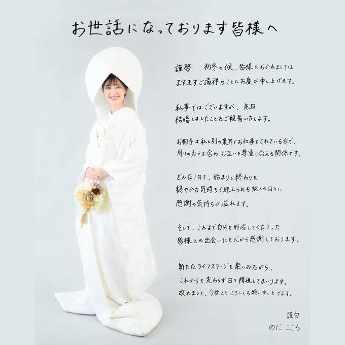 のださんは白無垢姿に直筆のメッセージを添えた写真を投稿し、自身の結婚について説明、感謝と抱負を述べています。