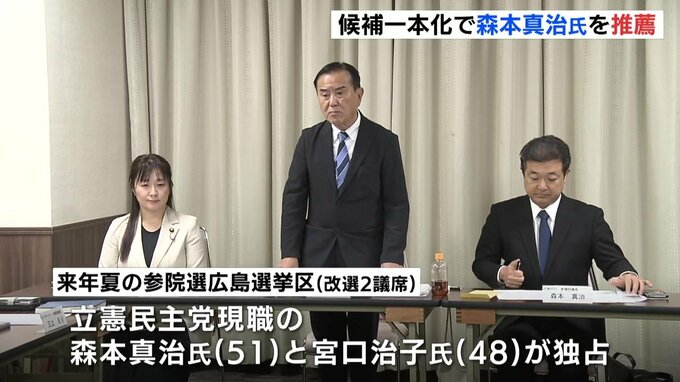 来年夏の参院選・広島選挙区で立憲民主党県連は、候補者を現職の 森本真治 氏に一本化し、党本部に推薦することを決めました。