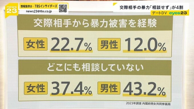 2023年の内閣府の調査では、女性で22.7%、男性は12.0%が交際相手から暴力被害を受けているそうです。このうち、どこにも相談していない割合は、女性が37.4%、男性が43.2%となっています。男性、女性と数字に違いはあれど苦しんでいる方がいるということですね。
