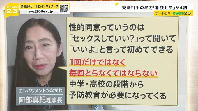 こうしたDV被害に詳しい専門家、「エンパワメントかながわ」の阿部真紀理事長によると、「性的同意っていうのは『セックスしていい?』って聞いて『いいよ』と言って初めてできる。1回だけではなく毎回とらなくてはならない。中学・高校の段階から予防教育が必要になってくる」とのことです。
