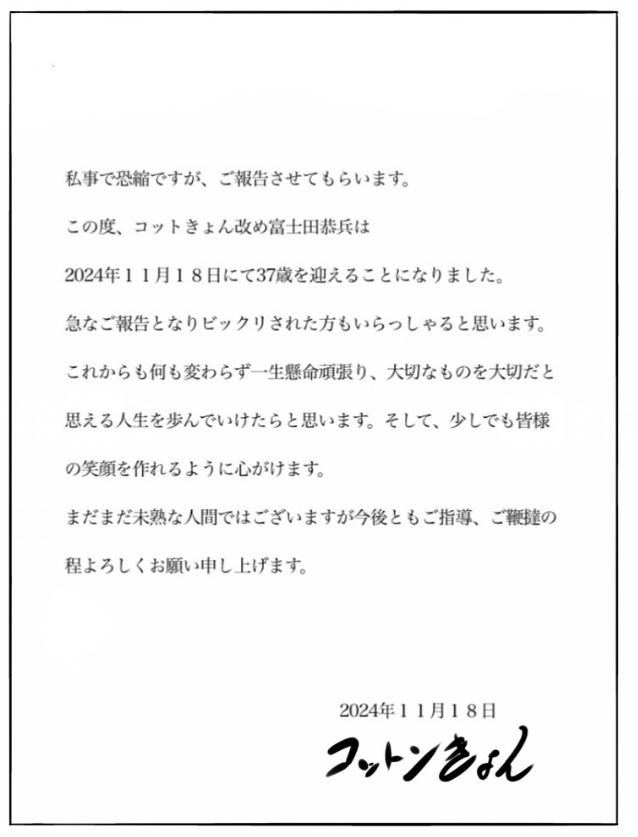 文面では「コットきょん改め富士田恭兵は 2024年11月18日にて37歳を迎えることになりました。」(原文ママ)と報告しました。