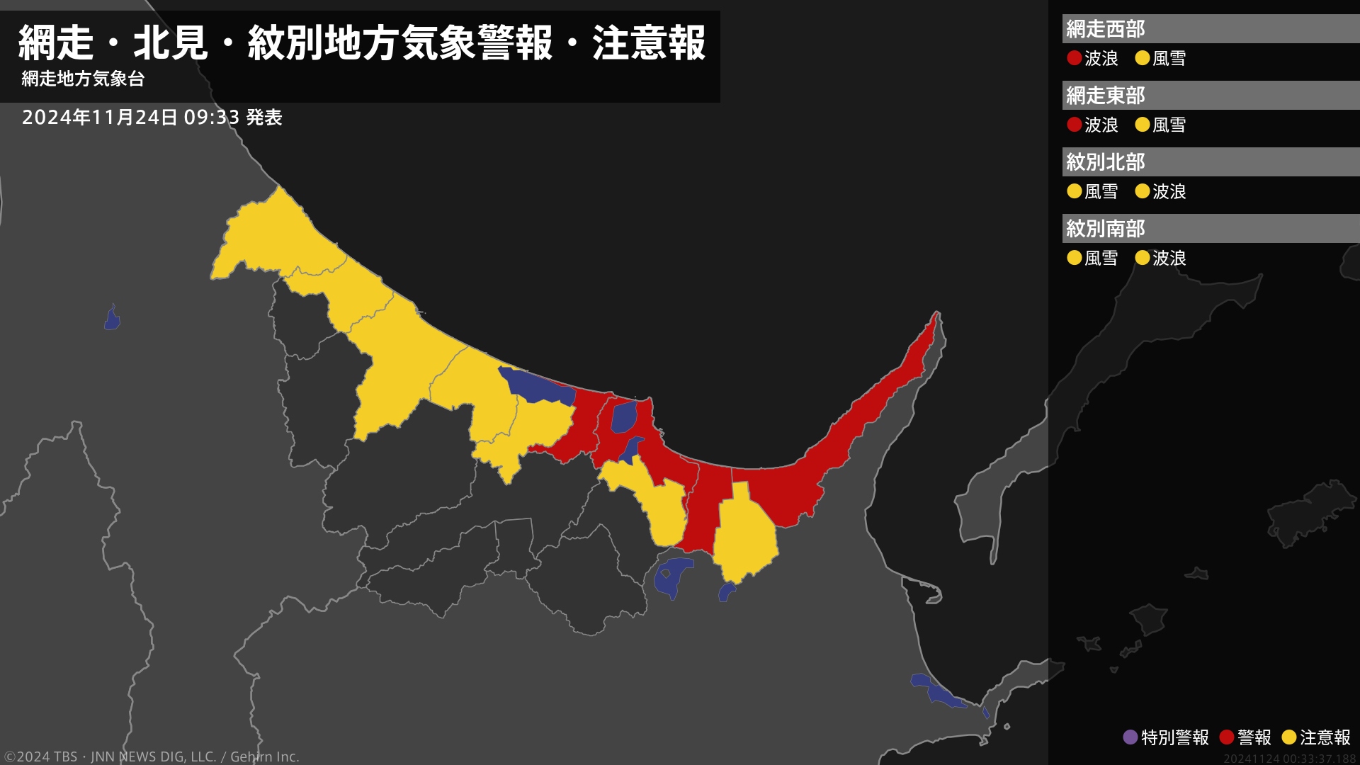 気象台は、午前9時33分に、波浪警報を北見市常呂、網走市、斜里町、小清水町に発表しました。