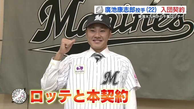 プロ野球ドラフト会議で、千葉ロッテマリーンズから5位指名を受けた東海大九州キャンパス(熊本・東区)の廣池康志郎(ひろいけ こうしろう)投手(22)が、入団契約を結びました。11月23日、熊本市内のホテルで球…