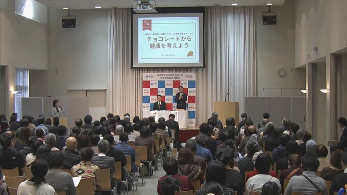 蒲郡市と愛知学院大学、そして明治の3者が共同で、「蒲郡スタディ」と呼ばれる「日本で初めてのチョコレート摂取による大規模研究」を行ってからことしで10年。24日は蒲郡市内で、「チョコレートから健康を考えよう」と題した10周年記念イベントが開かれ、イベントの一環として包括連携協定の締結式が行われました。